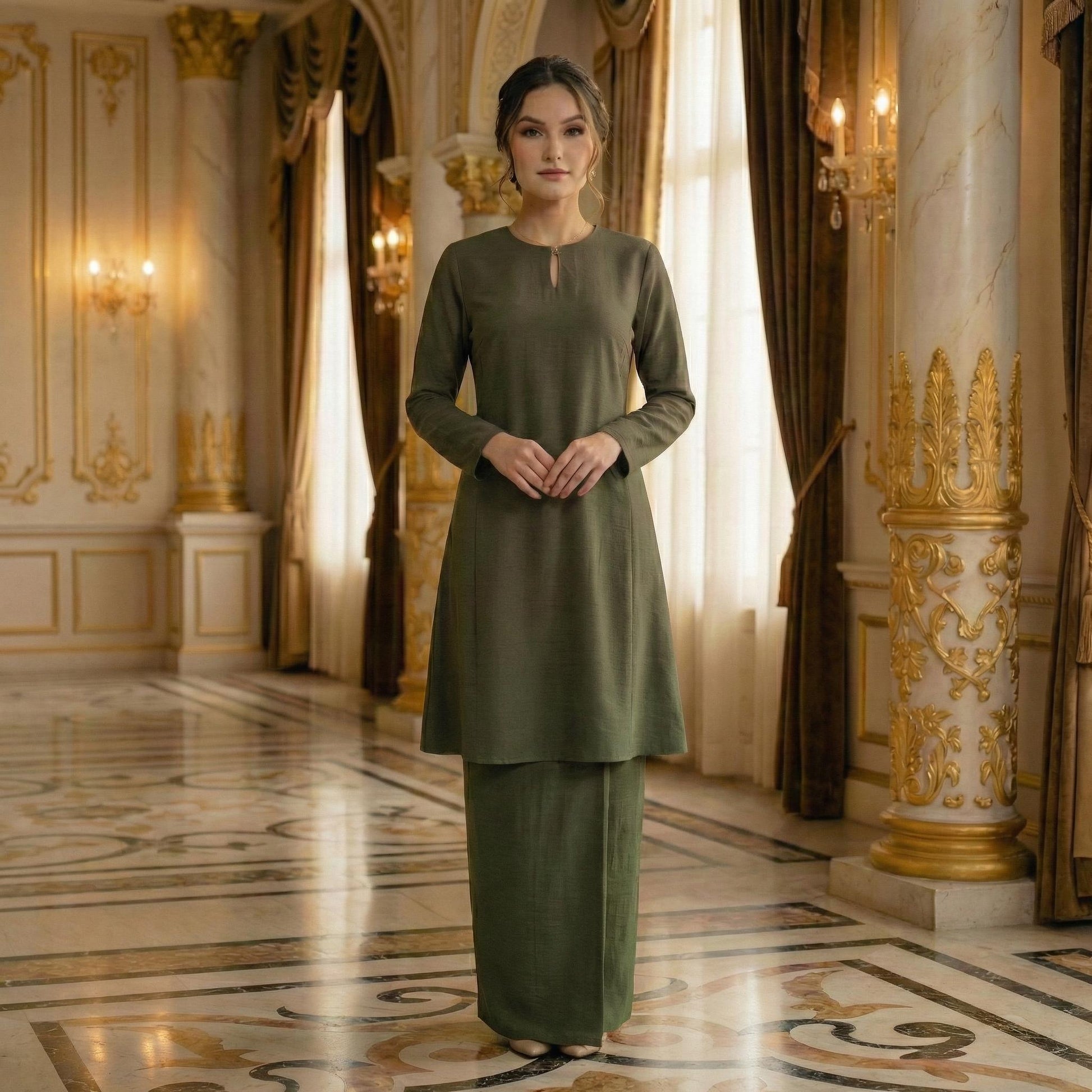 Baju Kurung Pahang Berpesak Material Cotton Plain (Moss Green)